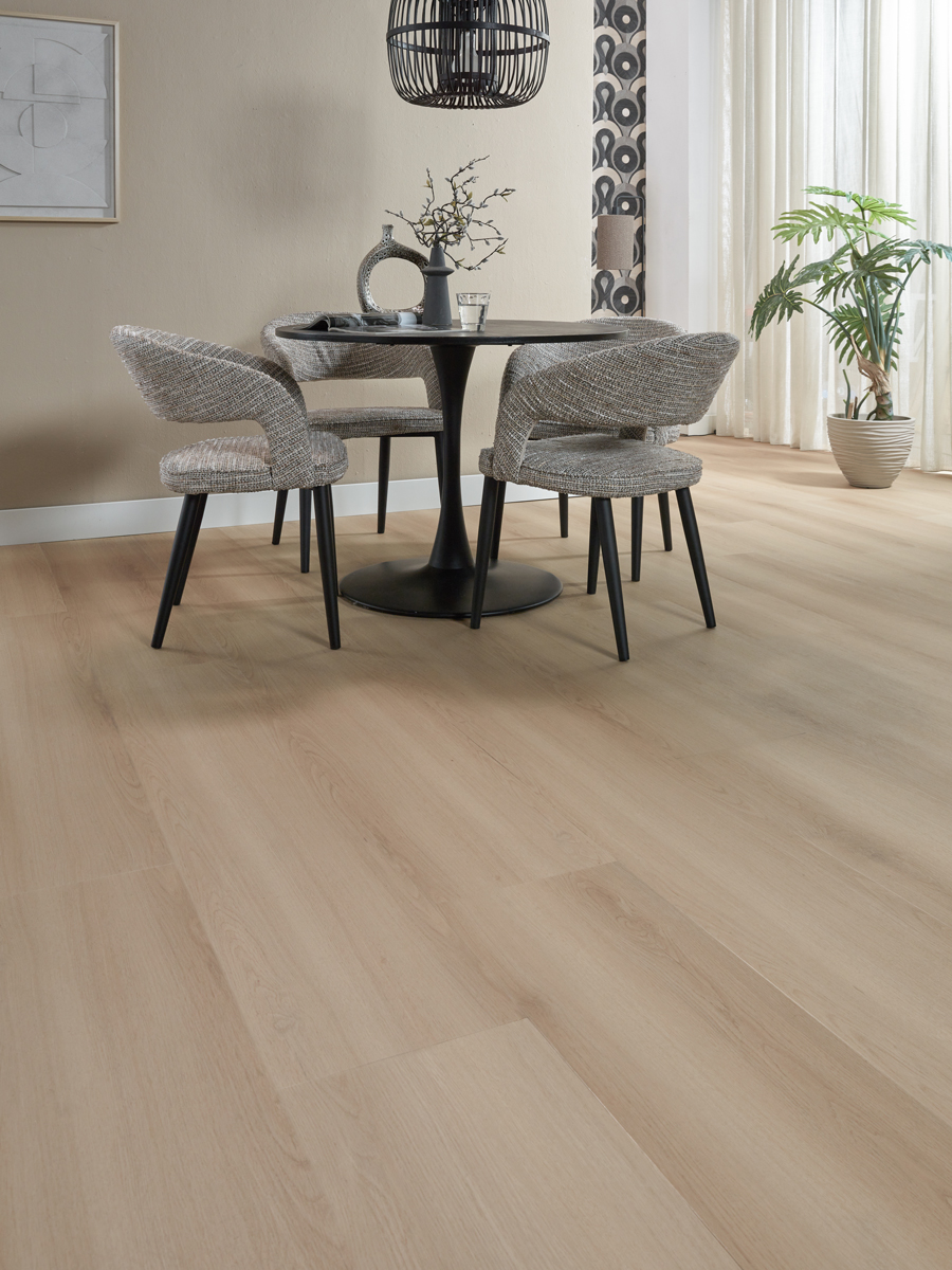 If you choose the Light Brown Oak Country House floor, you choose safety and durability. This Vinyl floor is produced without phthalates and carries quality marks such as FloorScore, Eurofins Gold, Emission class A+, EPD and GreenGuard Gold. The MEGAMAT finish provides extra grip, ideal in a house where children or pets run around. A sustainable and stylish choice that fits perfectly in any household.