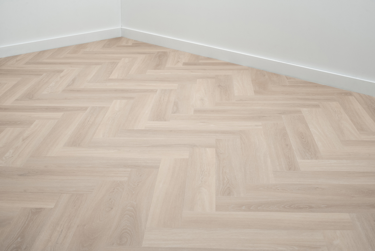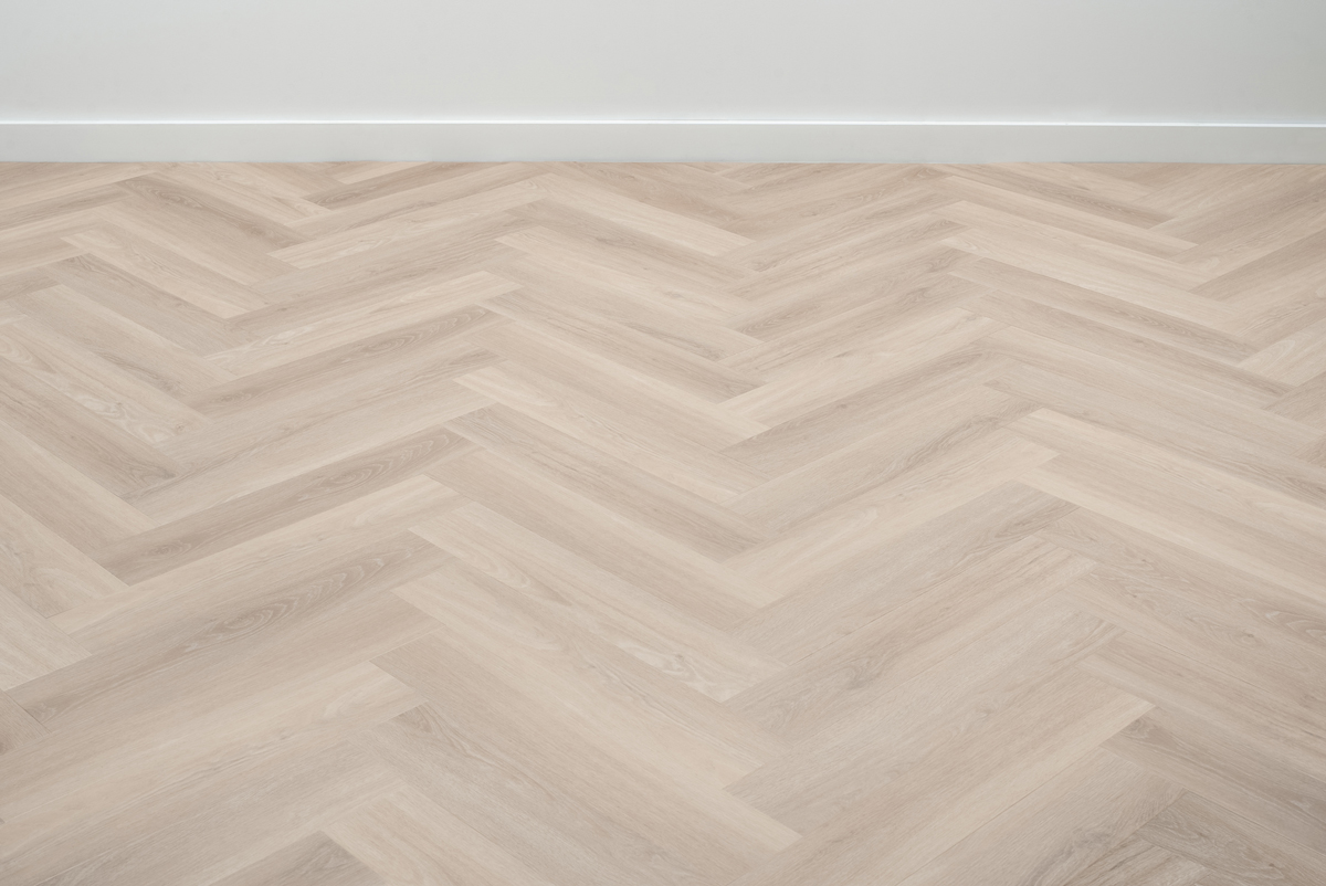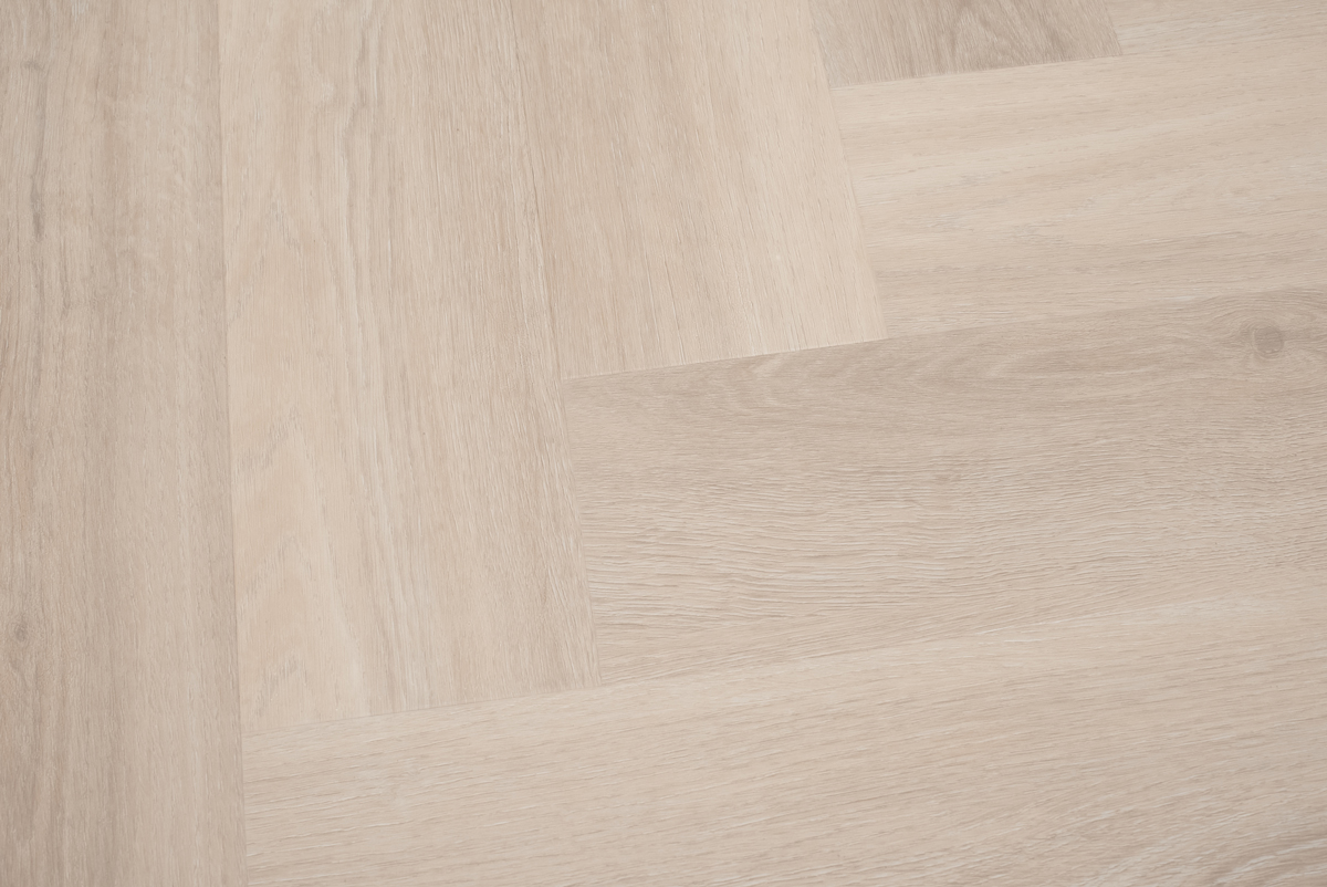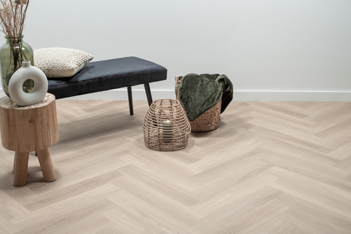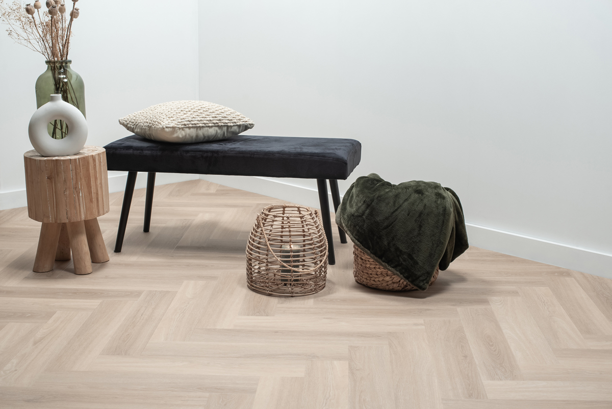 The Floer Herringbone Rigid Click Vinyl in the colour Pure Oak is a beautiful herringbone floor with a tangible structure. A rock-solid vinyl floor which doesn't need to be adhered to the subfloor. The easy Floer Unidrop system allows you to install your rigid click herringbone floor with ease by yourself, by using a rubber mallet. The floorboards are 61 cm long and 12,2 cm wide. The 'rigid mineral core' in between the layers makes sure that the floor is stable.