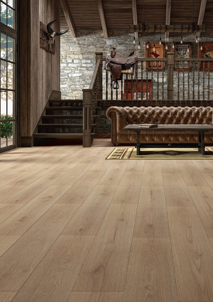 The mix of a warm beige undertone with a cool grey tint creates a subtle play of colour that shifts beautifully with the light. The tactile wood texture adds to its authentic look. Wide planks (21.4 cm) with 4-sided V-grooves give a clean, stylish appearance without losing the floor’s natural charm.