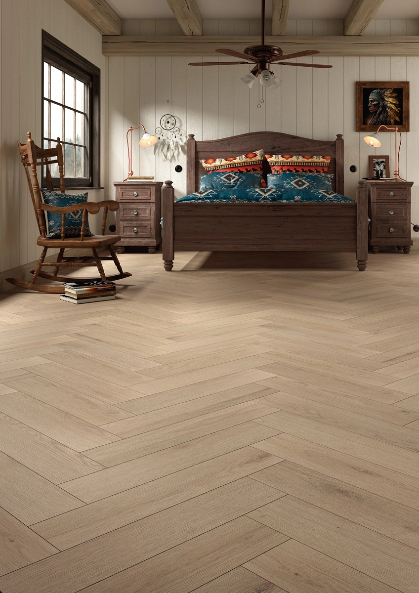 The unique greige colour adds calm and warmth, with a subtle tonal variation that shifts with the light in your home. The textured surface enhances the wood effect, while the 4-sided V-groove highlights the herringbone pattern for a clean, refined finish. The result is a floor with depth, character, and understated elegance.