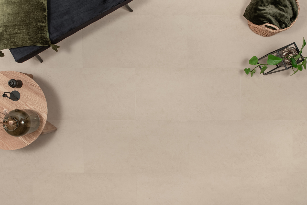 Strong, stable and beautiful to look at: Floer Tile Rigid Click Vinyl - Concrete Look Beige. The luxurious stone structure floors from this rigid click vinyl collection consist of tiles with a size of 91,4 x 45,7 cm! Whereas dryback vinyl needs to be adhered to the subfloor, this Tile Rigid Click Vinyl is easy and quick to install yourself, thanks to the convenient Fastclick system. Thanks to the stable 'rigid mineral core', this rigid click vinyl is not only rock-solid, but also remains stable on the floor.