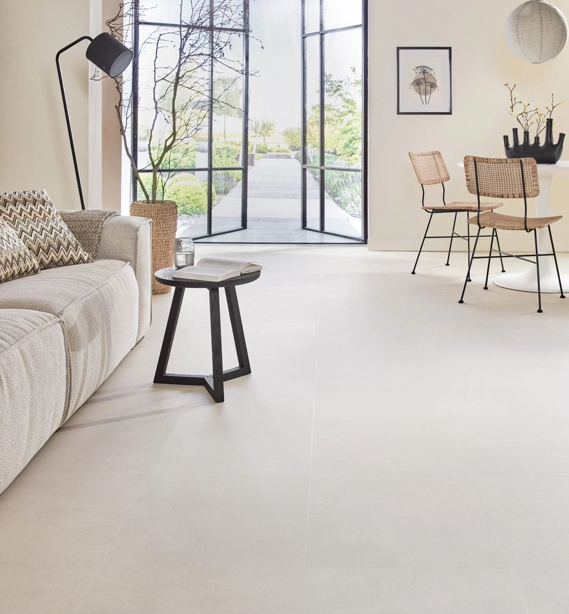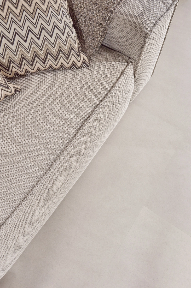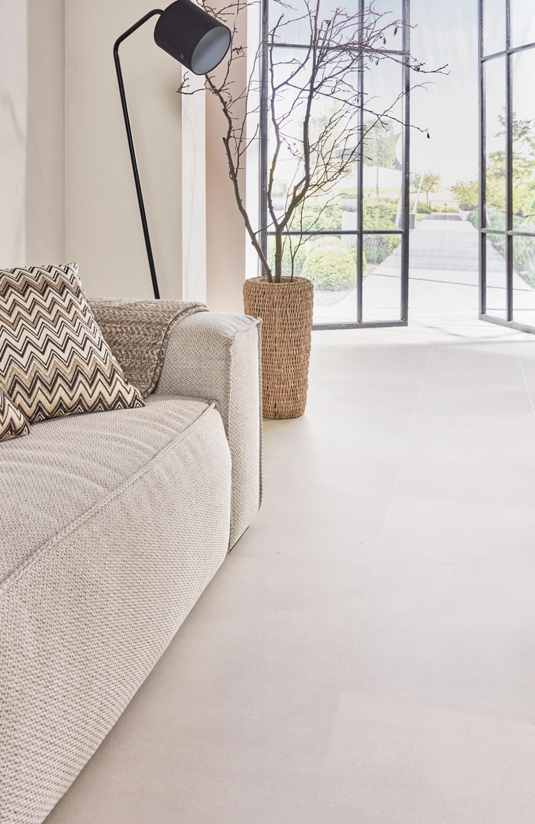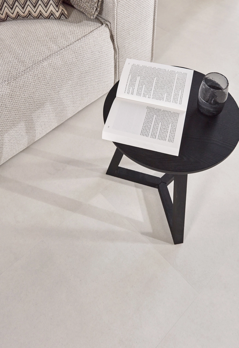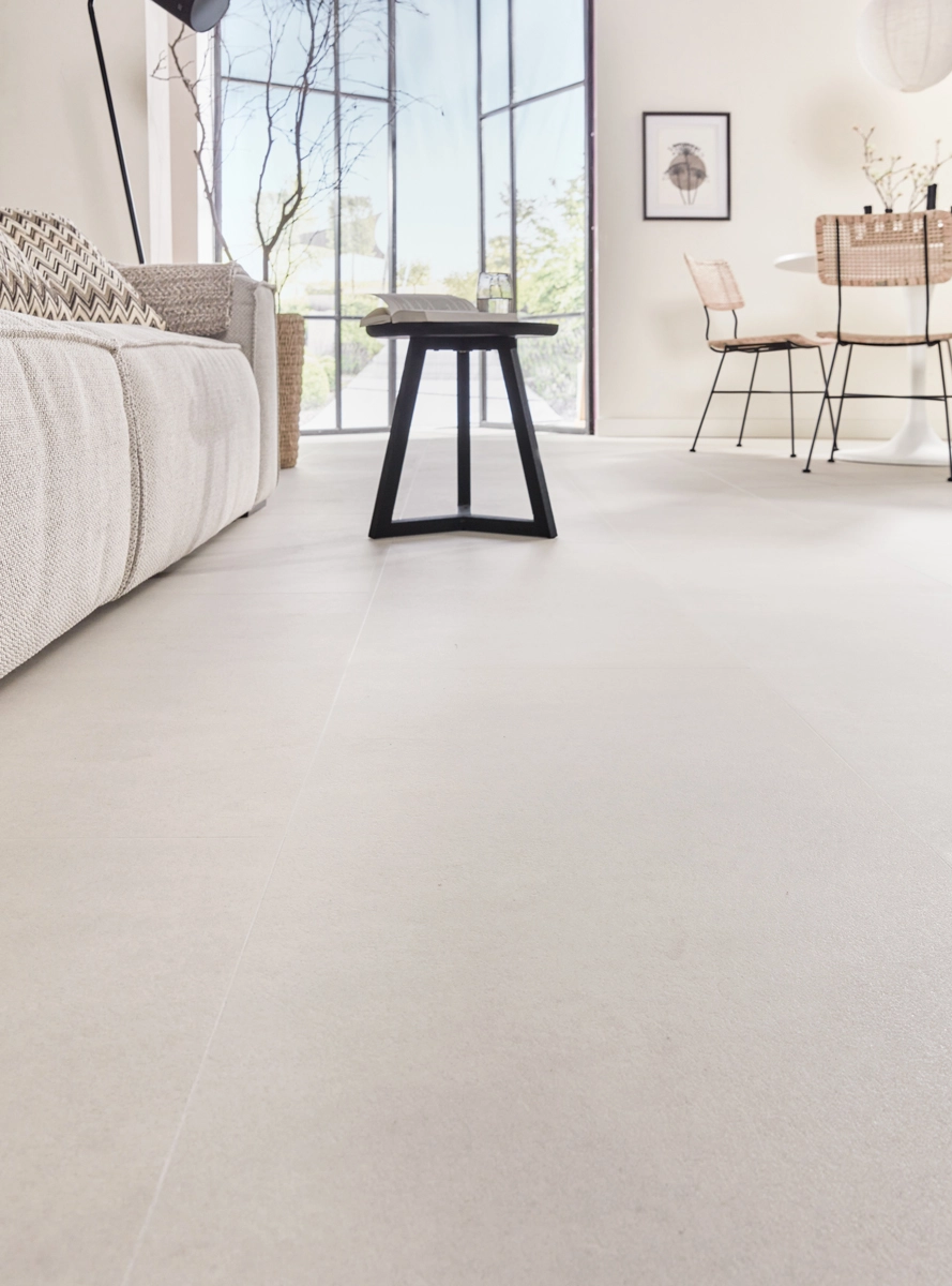 In addition to its water resistance, this tile floor is perfectly compatible with underfloor heating and cooling. The low thermal resistance of just 0.019 m²K/W ensures that you can enjoy warm feet in winter. With its sand-colored concrete look and practical features, this floor is the perfect choice for a versatile interior. It gives you the appearance of real concrete tiles but with all the benefits of Floer Vinyl.