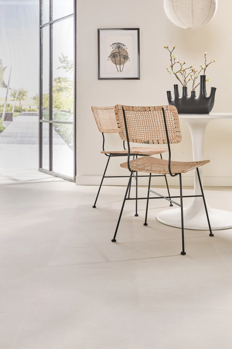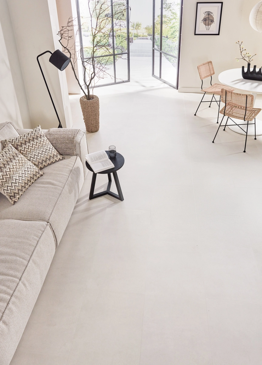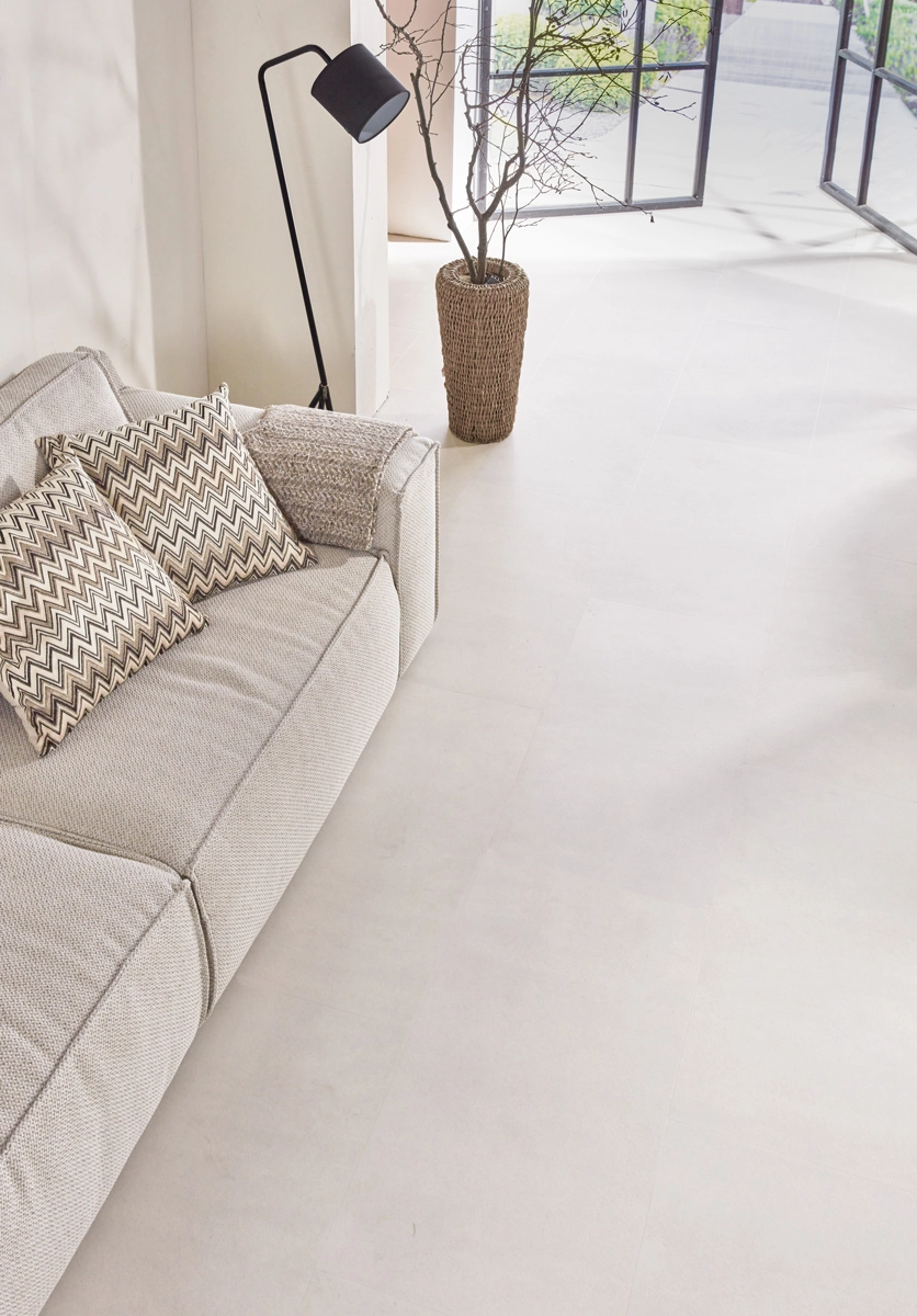 The Concrete Look Vinyl floor meets the highest environmental standards and carries important certifications such as FloorScore, Emission Class A+, EPD, Eurofins Gold, GreenGuard Gold, ISO14001, and REACH. The floor is phthalate-free and contains no harmful substances, contributing to a healthy living environment. The Concrete Look Sand Vinyl Tile Floor offers the ideal combination of style, durability, and easy maintenance.