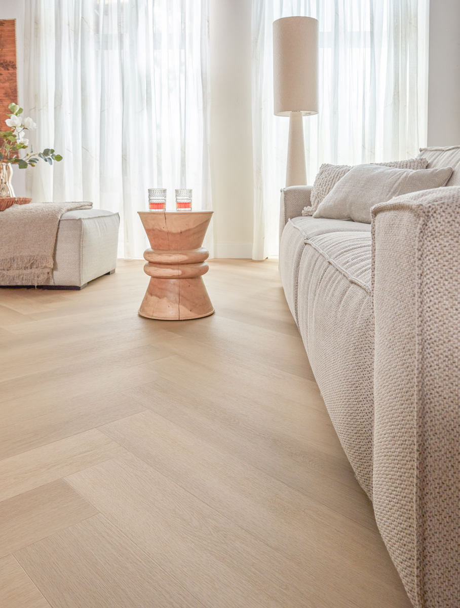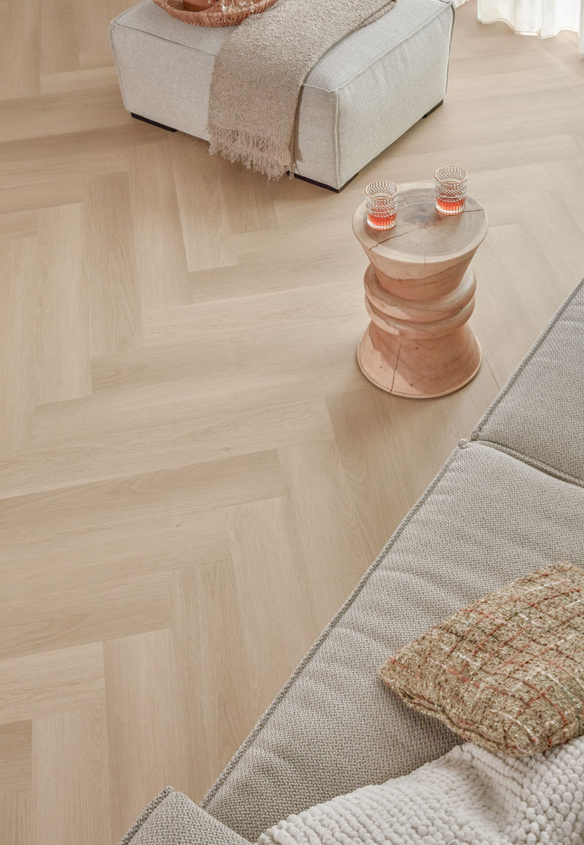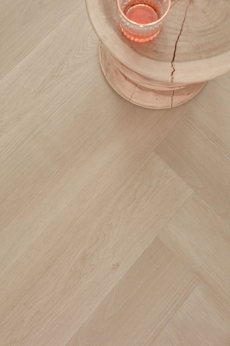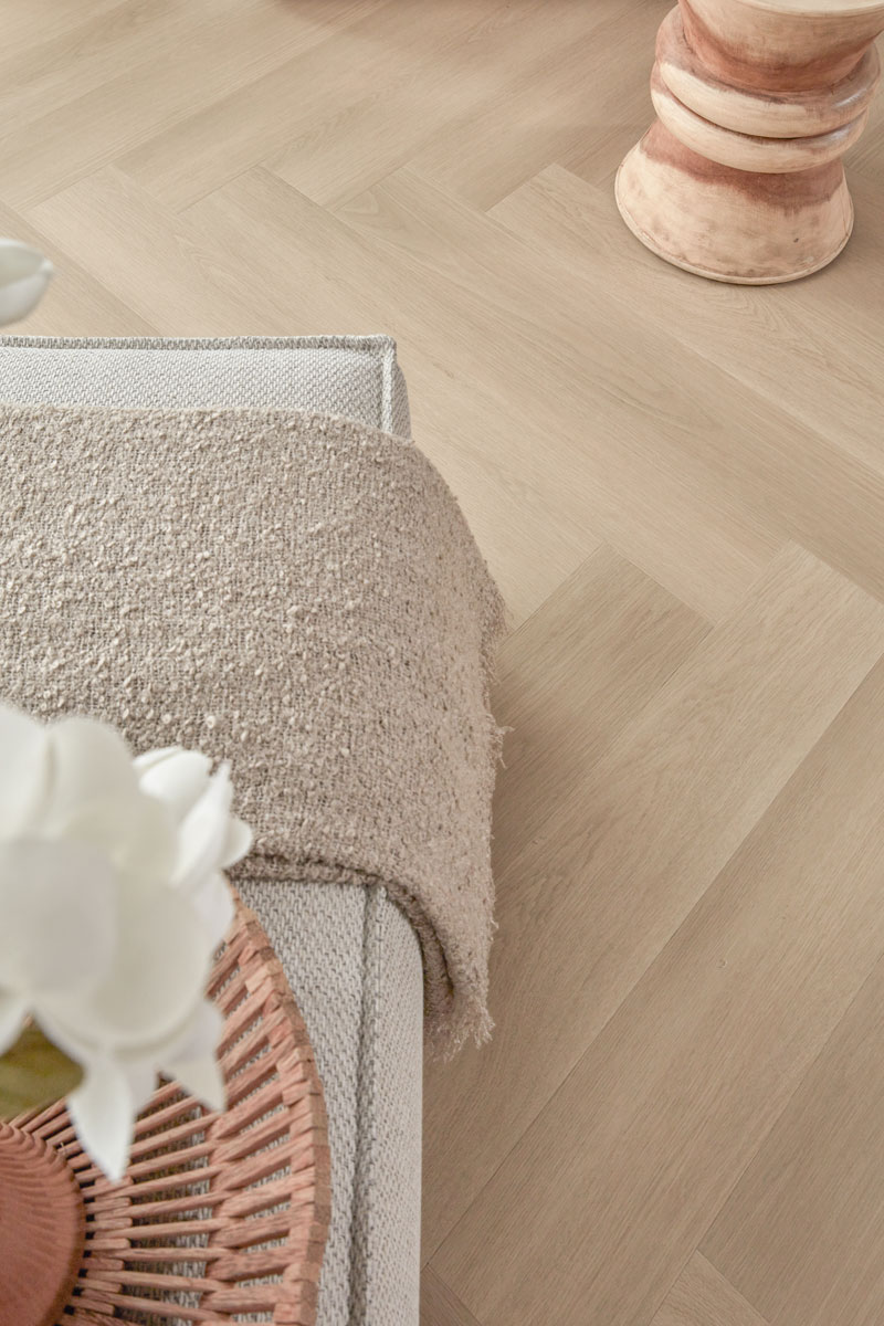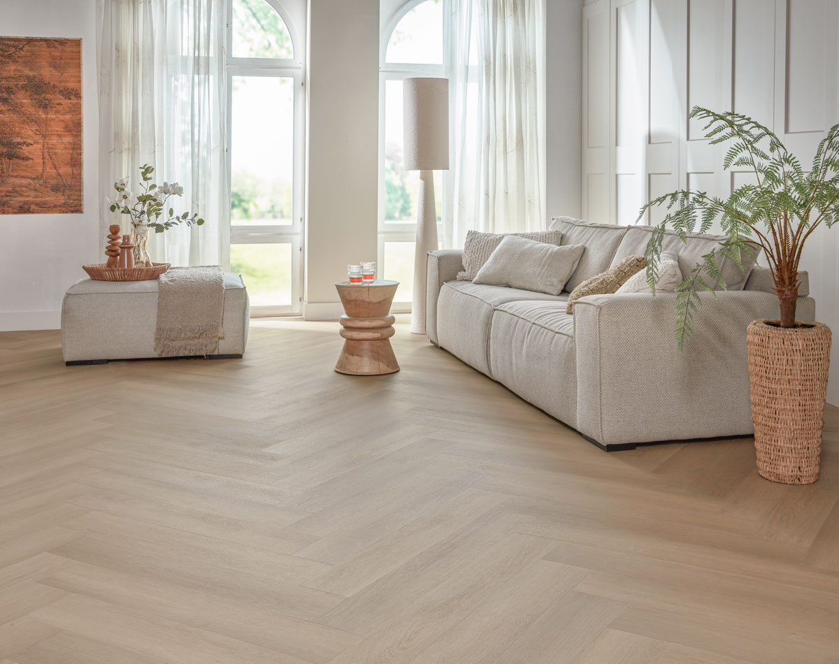 Discover the popular Floer Whalebone Rigid Click Vinyl in Swordfish Sand. Install the click connection yourself and achieve a realistic light oak look! With its beige colour, the Whalebone Rigid Click Vinyl - Swordfish Sand imitates the appearance of a real oak wood floor but offers all the benefits of click vinyl. These large rigid click vinyl floors come in a herringbone pattern and are bigger, wider, and longer than the "standard" herringbone rigid click vinyl floors. Thanks to their rigid mineral core, they are extremely stable and 100% waterproof.